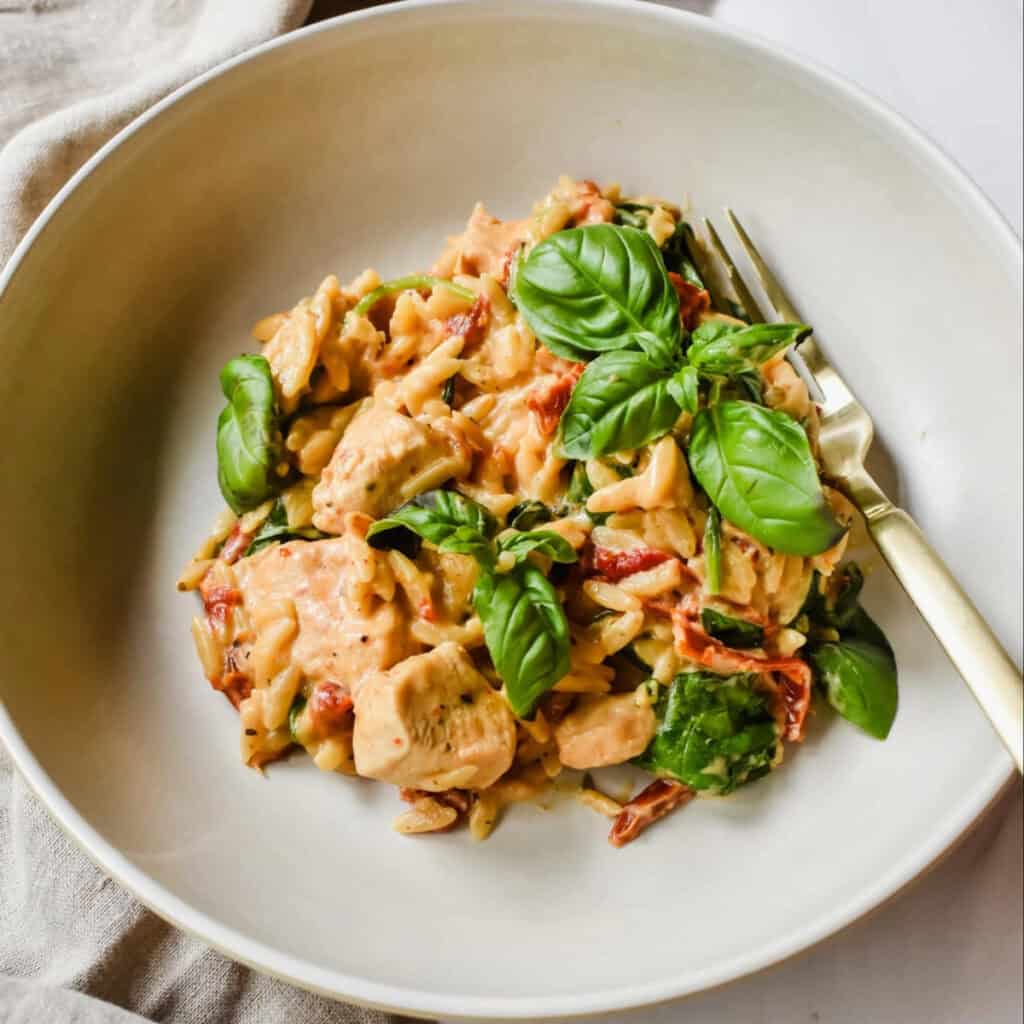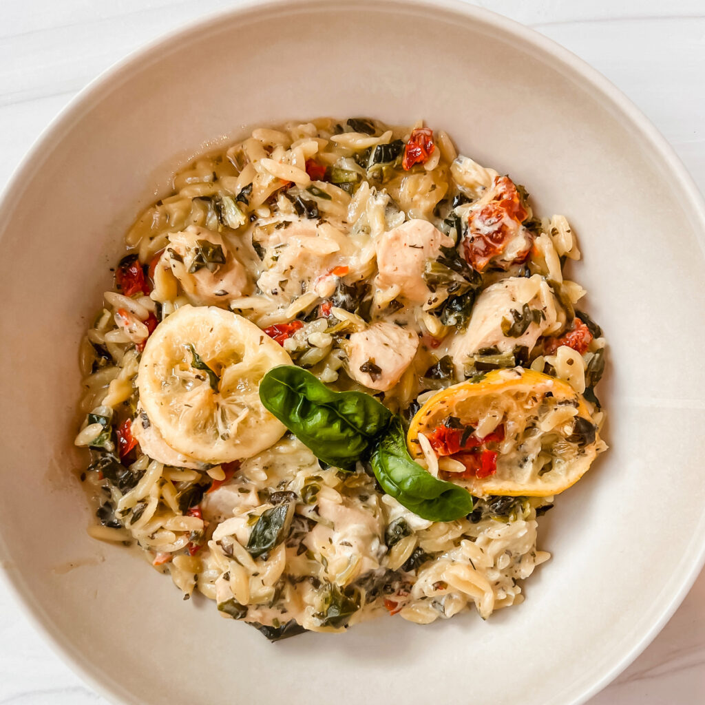 My one pot creamy lemon chicken orzo combines tender chicken cubes, flavorful minced garlic, and sun-dried tomatoes in a creamy sauce enriched with Boursin cheese. Spinach and fresh basil add a pop of color and freshness, while a squeeze of lemon brightens the dish!