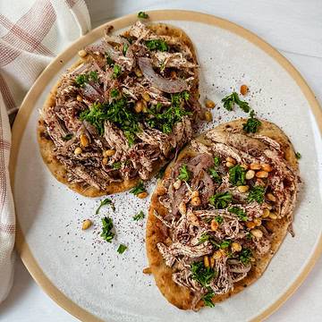 - Once your flatbreads are nice and crispy to your liking, top with the onion and chicken mixture. Then season with some additional sumac, toasted pine nuts and minced parsley, if using. Enjoy!