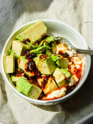 I serve these make ahead egg bites along with some additional fat, fiber and protein to make a complete and balanced breakfast that will help keep you full for hours.