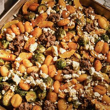 - Step 2: Add your veggies & gnocchi. On your large baking sheet, toss together the Brussels sprouts, delicata squash, and gnocchi. Drizzle with avocado oil and season with salt, pepper, garlic powder, onion powder, and smoked paprika. Toss until everything is evenly coated and spread into a single layer.