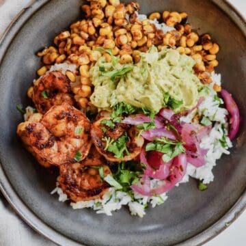 Step 5:Assemble your bowls: start with a base of cilantro lime rice, top with shrimp, corn, guacamole, and pickled red onions.Finish with extra lime wedges and some chopped cilantro, if desired. Enjoy!