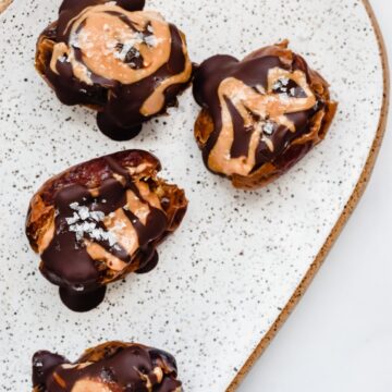3. In a small, microwaveable bowl, add your dark chocolate chips and your coconut oil and heat for 30 seconds. Remove and give it a quick stir, place back in the microwave and microwave for 15 second intervals, stirring in between, until your chocolate is completely melted. Using a spoon, drizzle your chocolate on top of each date per preference.