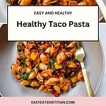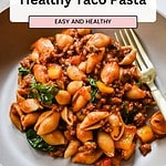 This healthy taco pasta is a quick and easy meal with a taco twist. This recipe uses lean ground beef, chickpea pasta shells, and lots of veggies for a healthy and balanced dinner or meal prep!