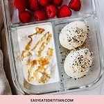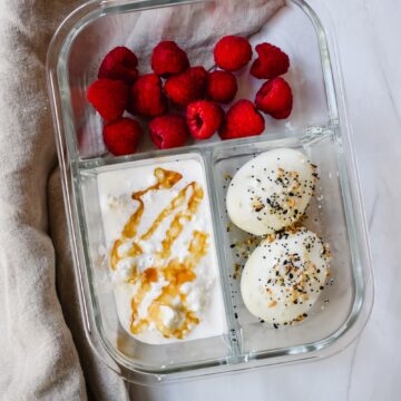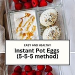 These instant pot eggs are perfect for meal prep. I make them ahead of time and store them in a glass bento box as part of a balanced breakfast or snack to enjoy throughout the week! I served mine with cottage cheese, honey and some raspberries for an extra high protein breakfast!
