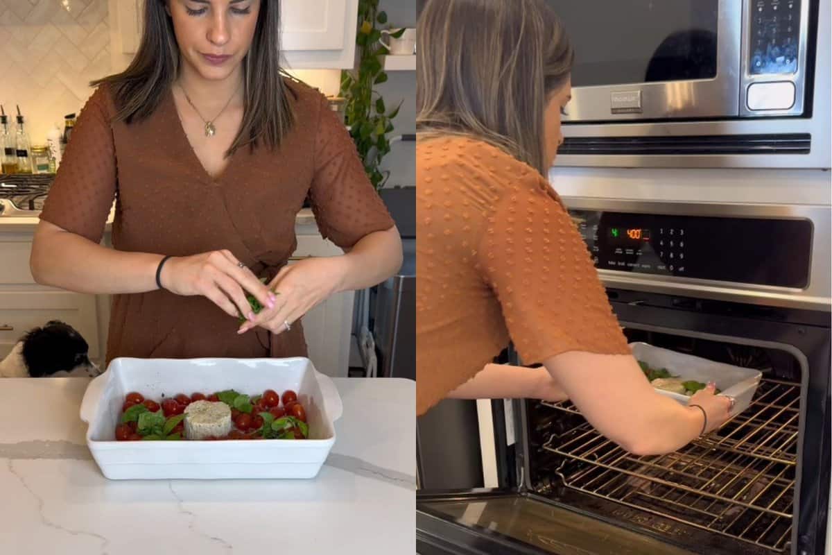 Preheat the oven to 400°F and set the rack to the middle position. Place the Boursin in the center of your ceramic baking pan. Then add your baby tomatoes followed by your crushed garlic.Drizzle olive oil and season with salt and pepper to taste. Add your fresh chives and basil (alternatively, you can wait to add your fresh herbs until after you are done cooking).