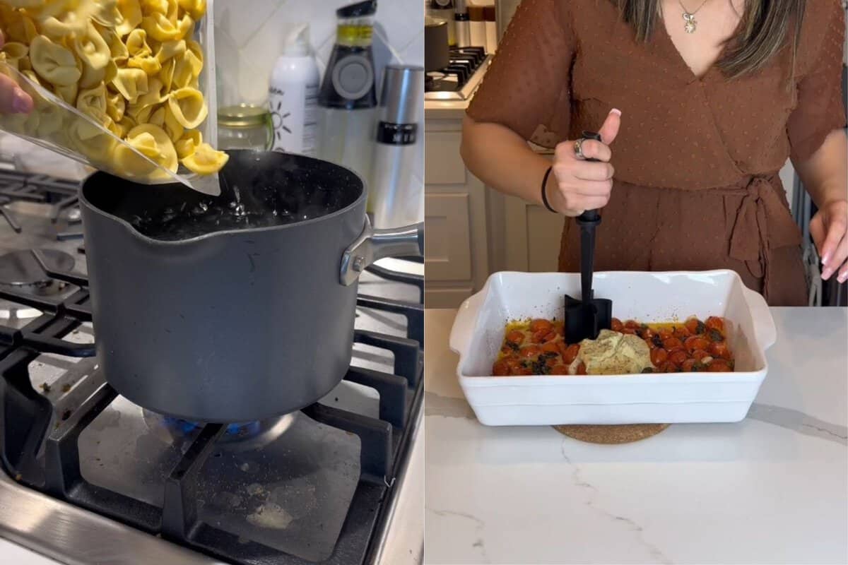 - When your tomatoes and Boursin are almost done baking, prepare your tortellini according to the instructions on the packaging.