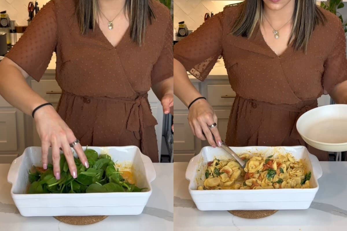 Add in your fresh spinach and mix until everything is well combined. Then add in your drained and cooked tortellini.