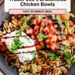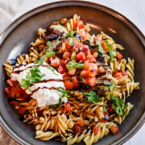 - Step 3: Assemble the bowls: Start with a base of the cooked fusili pasta. Add sliced grilled chicken on top. Spoon over a generous scoop of bruschetta sauce. Nestle in half a ball of burrata per bowl. Finish with a big drizzle of balsamic glaze and a pinch of fresh herbs if you're feeling fancy! Enjoy!