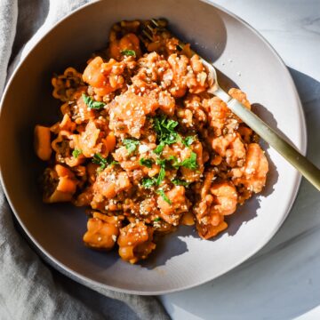 While you can enjoy a variation of this dish year round, this particular recipe uses Trader Joe's seasonal Autumnal Harvest pasta sauce to make a cozy dish perfect for fall!