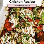 - Add your pre-marinated pesto chicken breast to a ceramic baking dish. Spread the chicken out so that it's in an even, single layer. Then add in your washed cherry tomatoes on top in an even layer,