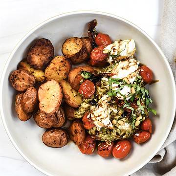 - Drizzle with some balsamic glaze in an even layer, top with shredded basil and toasted pine nuts. Serve with white rice, brown rice, or roasted potatoes for a more filling and satisfying meal. Feel free to also pair with a side salad for some additional fiber.